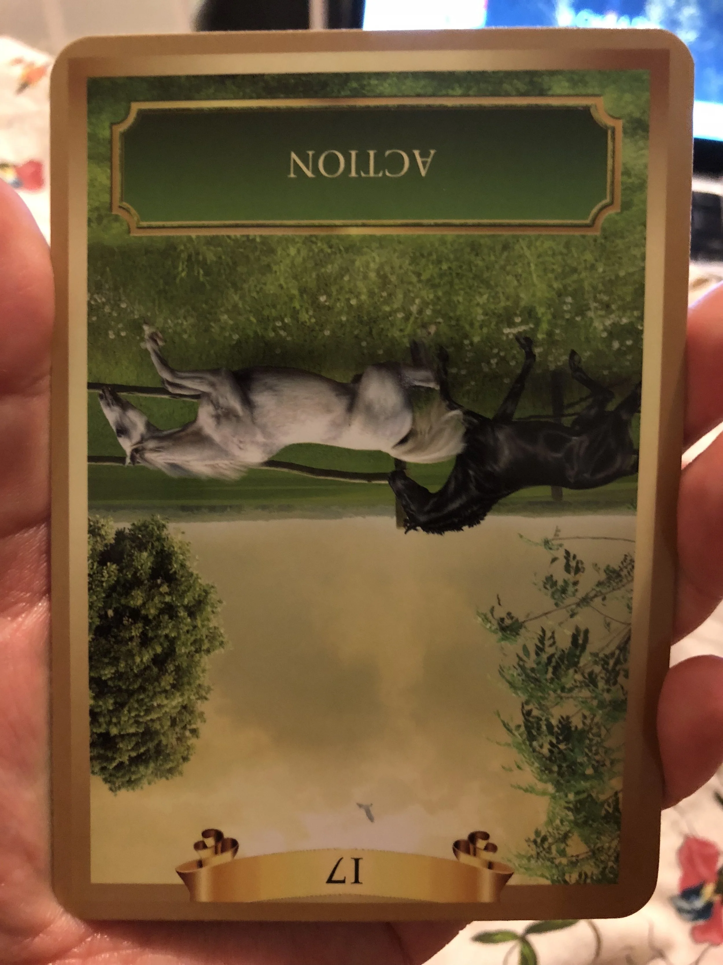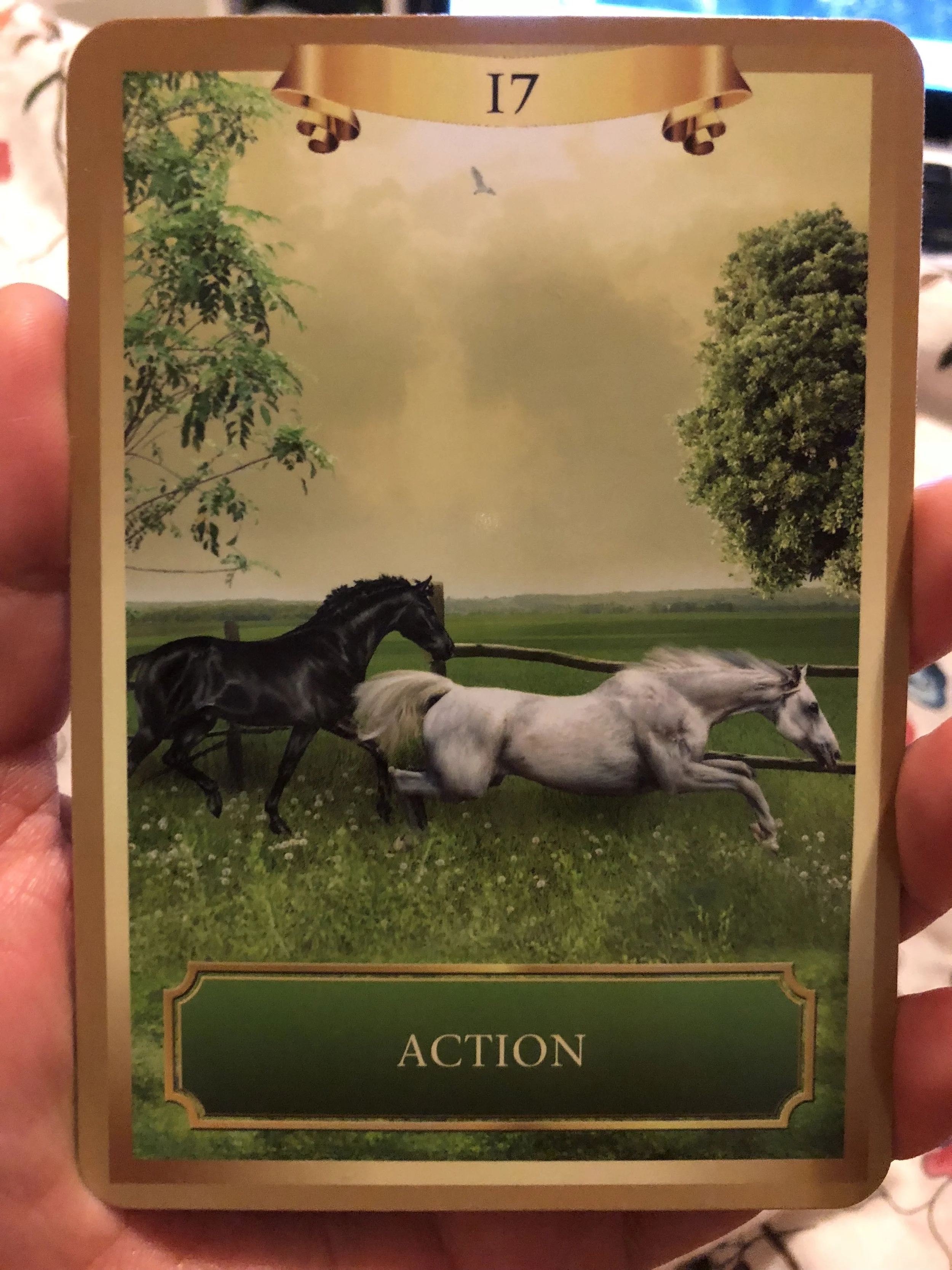 This card is telling you to move aggressively forward in your actions. You are on the right track and your efforts need to increase towards your goals. The white horse is based on your inner action of thought and spirit and then the black horse is the outer work that still needs to be done. Trust and you’ll start to see results.